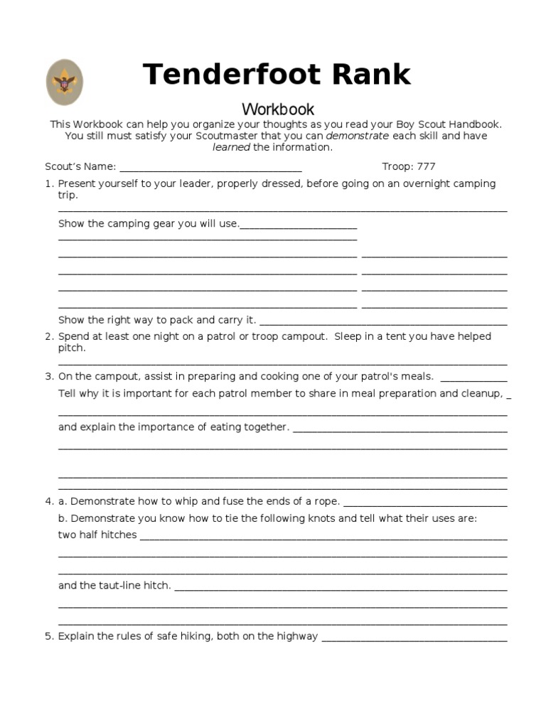 Tenderfoot Rank Workbook Worksheet for 5th 7th Grade Lesson